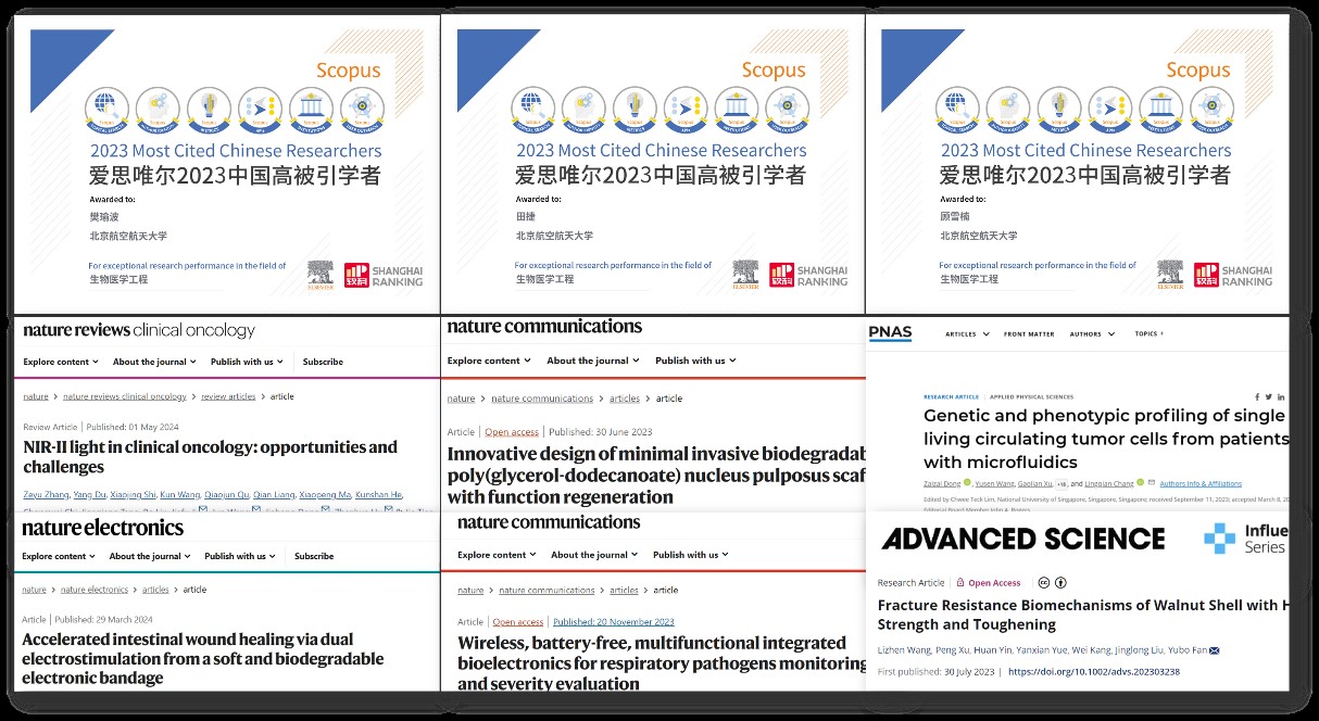 学科群樊瑜波、田捷、顾雪楠3位教师入选爱思唯尔2023“中国高被引学者”榜单。科研成果连续发表在Nature Reviews Clinical Oncology、Nature Electronics、Nature Communications、PANS、Science Advances等顶级期刊。
